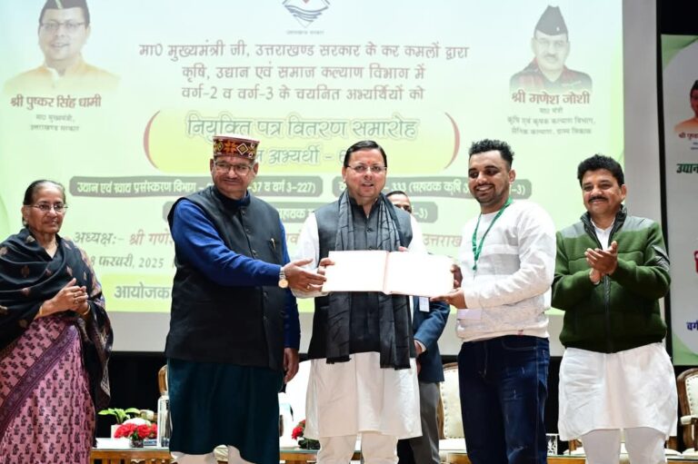 आज मुख्यमंत्री पुष्कर सिंह धामी ने हिमालय संस्कृत ऑडिटोरियम देहरादून में आयोजित ‘नियुक्ति पत्र वितरण कार्यक्रम’ में कृषि, उद्यान, समाज कल्याण विभाग में चयनित 609 अभ्यर्थियों को नियुक्ति पत्र वितरित किए। इस अवसर पर सीएम धामी ने सभी अभ्यर्थियों को बधाई एवं शुभकामनाएं दी। उन्होंने कहा कि मुझे पूर्ण विश्वास है कि सभी नव नियुक्त अभ्यर्थी उत्तराखंड में कृषि क्षेत्र के उत्थान और समाज कल्याण के संकल्प को लेकर अपने कर्तव्य का निर्वहन करेंगे। राज्य में सख्त नकल विरोधी कानून लागू होने के बाद सभी भर्ती परीक्षाएं पूरी पारदर्शिता के साथ संपन्न हो रही है। पिछले ढाई तीन साल में 20000 से अधिक युवाओं को राज्य की सरकारी सेवाओं में नियुक्त पत्र प्रदान किया जा चुके हैं आगे भी यहां प्रक्रिया जारी रहेगी।