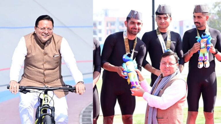 मुख्यमंत्री पुष्कर सिंह धामी ने 38वें राष्ट्रीय खेल में स्पोर्ट्स स्टेडियम वेलोड्रोम में साइकिलिंग पदक विजेताओं को मेडल पहना कर सम्मानित किया व शुभकामनाएं दी। मुख्यमंत्री ने मनोज सरकार स्पोर्ट्स स्टेडियम में चल रहे 38वें राष्ट्रीय खेलों के अन्तर्गत शिवालिक वेलोड्रोम में ट्रैक साईकिलिंग प्रतियोगिता को दर्शक दीर्घा से देखा।
