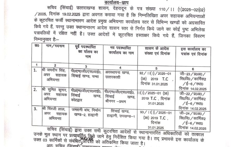 सचिव के फर्जी हस्ताक्षर से यह ट्रांसफर 31 जनवरी को किए गए। जिसमें अपर सहायक अभियंता जयदीप सिंह को पीएमजीएसवाई सिंचाई खंड चंबा से अवस्थापन खंड उत्तरकाशी, अपर सहायक अभियंता सुमित कुमार को पीएमजीएसवाई सिंचाई खंड कोटद्वार से पीएमजीएसवाई सिंचाई खंड श्रीनगर प्रथम और अपर सहायक अभियंता चिरंजी लाल को जर्मनी बांध निर्माण खंड 2 हल्द्वानी से सिंचाई खंड हल्द्वानी उपखंड 1 में भेज दिया गया।